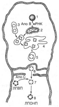 1 - ядро; 2 - шероховатый эндоплазматический ретикулум; 3 - гладкий эндоплазматический ре-тикулум, синтезированные в нем липиды и образовавшиеся н-ЛПОНП; 4 - аппарат Гольджи; 5 -секреторная везикула с частицей н-ЛПОНП; 6 -частица с н-ЛПОНП в пространстве Диссе; 7 -перенос апопротеинов С с ЛПВП на н-ЛПОНП; 8 - частица нативных ЛПОНП.