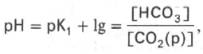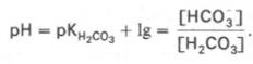 Истинная концентрация недиссоциированных молекул Н2СО3 в крови незначительна и находится в прямой зависимости от концентрации растворенного углекислого газа (СО2 + Н2О <=> Н2СО3). Поэтому удобнее пользоваться тем вариантом уравнения, в котором рКH2СО3 заменена «кажущейся» константой диссоциации Н2СО3, учитывающей общую концентрацию растворенного СО2 в крови: