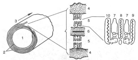 1 - аксон; 2 - миелин; 3 - ось волокна; 4 - белок (наружные слои); 5 - липиды; 6 - белок (внутренний слой); 7 - холестерин; 8 - цереброзид; 9 - сфингомиелин; 10 - фосфатидилсерин.