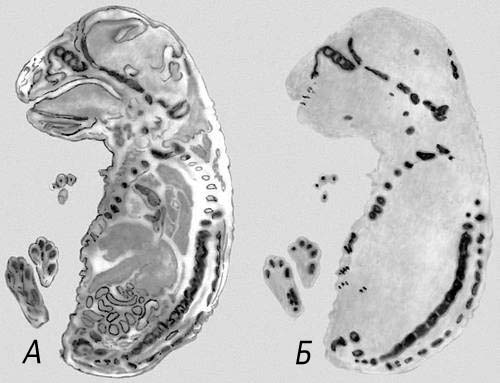 Рис. 3. Избирательное накопление радиоизотопа серы (35S) в хрящевой ткани 20-дневного зародыша крысы: А — окрашенный срез; Б — радиоавтограф.