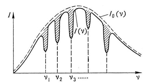 Зависимость интенсивности падающего I0(n) и прошедшего через вещество I(n) излучения. n1, n2, n3,... — собственные частоты вещества; заштрихованные области — полосы поглощения.