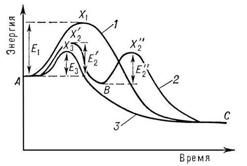 Изменение энергии реакционной системы вдоль пути реакции. А — исходное состояние; состояния, соответствующие образованию: В — промежуточного соединения, С — конечных продуктов, X1, X'2, Х"2, X3 — активных комплексов.