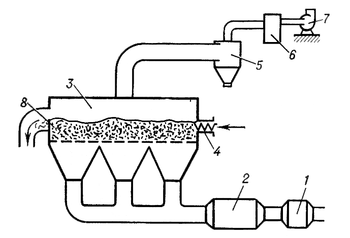 Аппараты с кипящим слоем широко применяются в промышленности благодаря простоте устройства, интенсивности действия, лёгкости благодаря простоте устройства, интенсивности действия, легкости автоматизации, относительно небольшому гидравлическому сопротивлению слоя (независимо от скорости ожижающего агента. Помимо осуществления химических процессов, их используют для адсорбции веществ из газов и жидкостей, теплообмена, сушки твердого материала, а также для его перемешивания, классификации и транспортировки. Примером, наглядно демонстрирующим работу аппарата с кипящим слоем, является действие установки для сушки в кипящем слое (). Воздух поступает через фильтр 1 и калорифер 2 в сушильную камеру 3, где создаётся кипящий слой материала, подаваемого шнеком 4. После обеспыливания в циклоне 5 и очистки в фильтре 6 воздух выбрасывается в атмосферу вентилятором 7. Высушенный материал переливается через порог 8 и удаляется из аппарата. Другим примером аппаратов такого типа является кипящего слоя печь.