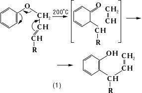 Клайзена перегруппировка, миграция аллильной или замещенной аллильной группы в аллиловых эфирах фенолов (1) или енолов (2) с образованием соответственно орто-аллилфенолов или С-аллильных производных кето-енолов: