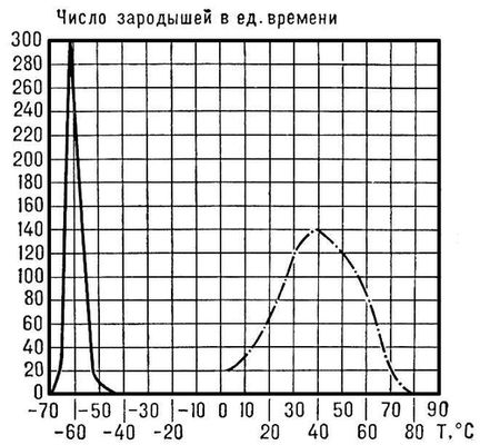 Рис. 2. Сплошная кривая — зависимость числа зародышей кристаллов глицерина, возникающих в 1 см3 расплава в единицу времени, от температуры; пунктирная кривая — то же для 1,2 см3 расплава пиперина.