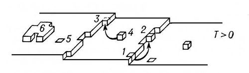 Рис. 5. Характерные положения атома на атомно гладкой поверхности кристалла со ступенями: 1 — в торце ступени; 2 — адсорбция на ступени; 3 — в изломе; 4 — адсорбция на поверхности; 5 — в поверхностном слое кристалла; 6 — двумерный зародыш на атомно гладкой грани.