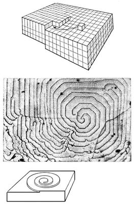 Если кристалл содержит винтовую дислокацию, то его атомные слои подобны этажам гаража с винтовым выездом в середине. Надстройка такого кристалла происходит присоединением атомов к торцу последней ступени (рис. 4, а). В результате кристаллический слой растет, непрерывно накручиваясь сам на себя, надстраивая дислокацию, а ступень в процессе роста принимает форму спирали (рис. 4, б, в). Дислокация обеспечивает при малых переохлаждениях квадратичную зависимость скорости роста грани от переохлаждения (пересыщения), т. е. заметную скорость роста уже при малых отклонениях от равновесия.