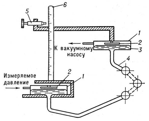 Рис. 3. Схема манометра абсолютного давления с ёмкостным отсчётом показаний: 1 — сосуды; 2 — металлические пластины; 3 — ртуть; 4 — стеклянные соединительные трубки; 5 — отсчётный микроскоп; 6 — шкала.