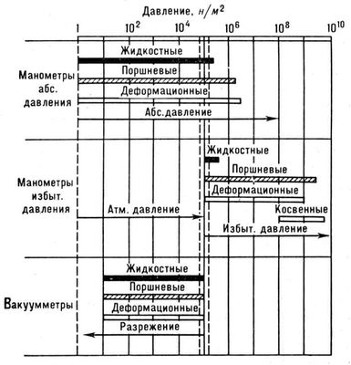 Рис. 1. Области применения манометров различных типов.