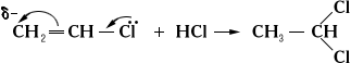 Присоединение по Марковникова правилу HCl к винилхлориду с образованием этилиденхлорида объясняется сопряжением неподелённой электронной пары атома хлора с p-связью: