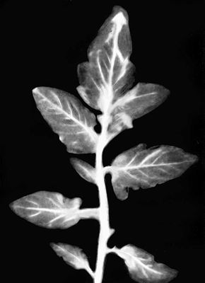 Рис. 2. Авторадиограмма (отпечаток), показывающая распределение фосфора (32Р) в листьях помидора. Растение помещалось предварительно в раствор, содержащий радиоактивный фосфор. Светлые участки соответствуют повышенным концентрациям радиоактивного изотопа; можно видеть, что фосфор сконцентрировался у стебля и в сосудистых частях листьев.