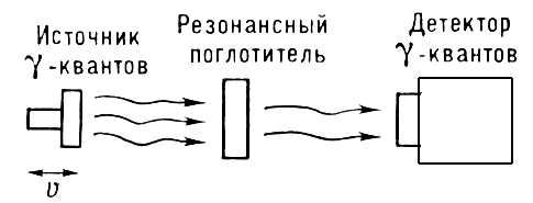 Под влиянием внутренних электрических и магнитных полей, действующих на ядра атомов в твёрдых телах (см. Кристаллическое поле), а также под влиянием внешних факторов (давление, внешние магнитные поля) могут происходить смещения и расщепления уровней энергии ядра, а следовательно, изменения энергия перехода. Т. к. величины этих изменений связаны с микроскопической структурой твёрдых тел, изучение смещения линий испускания и поглощения даёт возможность получить информацию о строении твёрдых тел. Эти сдвиги могут быть измерены с помощью мёссбауэровских спектрометров (рис. 3). Если g-кванты испускаются источником, движущимся со скоростью v относительно поглотителя, то в результате эффекта Доплера энергия g-квантов, падающих на поглотитель, изменяется на величину Ev/c (для ядер, обычно применяемых при наблюдении Мёссбауэра эффекта, изменение энергии E на величину G соответствует значениям скоростей v от 0,2 до 10 мм/сек). Измеряя зависимость величины резонансного поглощения от v (спектр мёссбауэровского резонансного поглощения), находят то значение скорости, при котором линии испускания и поглощения находятся в точном резонансе, т. е. когда поглощение максимально. По величине v определяют смещение DE между линиями испускания и поглощения для неподвижных источника и поглотителя.