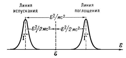 При облучении вещества g-квантами наряду с обычными процессами взаимодействия (см. Гамма-излучение) возможно резонансное поглощение g-квантов ядрами, при котором g-квант исчезает, а ядро возбуждается, т. е. переходит в состояние с большей внутренней энергией. Это явление аналогично резонансному поглощению световых квантов (фотонов) атомами (см. Атом, Квантовая электроника). Необходимое условие резонансного поглощения состоит в том, чтобы энергия, которую квант расходует на возбуждение ядра, равнялась бы в точности энергии квантового перехода, т. е. разности внутренних энергий ядра в возбуждённом и основном состояниях. На первый взгляд это условие автоматически удовлетворяется, когда излучающие и поглощающие ядра одинаковы (рис. 1). Однако g-квант с энергией E обладает импульсом p = E/с (где с — скорость света, см. Корпускулярно-волновой дуализм), и по закону сохранения импульса при излучении или поглощении кванта ядром последнее испытывает отдачу. Излучающее ядро массы М, получив импульс приобретает кинетическую энергию DE = р2/2М = E2/2Мс2. Т. о., часть энергии g-перехода трансформируется в кинетическую энергию ядра и энергия испущенного кванта меньше полной энергии g-перехода на величину DE. Такая же энергия DE передаётся свободному (покоящемуся) ядру и в процессе поглощения. Поэтому для достижения резонанса падающий на ядро g-квант должен иметь энергию на величину DE большую, чем энергия перехода. В результате линии испускания и поглощения оказываются смещенными друг относительно друга на величину 2DE = E2/Мс2 (рис. 2).