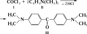 Михлера кетон, ди-п-диметиламинобензофенон, серебристо-зеленоватые кристаллы (tпл 179 °С), практически нерастворимые в воде, эфире, спирте, растворимые в пиридине и тёплом бензоле. В промышленности Михлера кетон (III) получают действием фосгена (1) на диметиланилин (II):