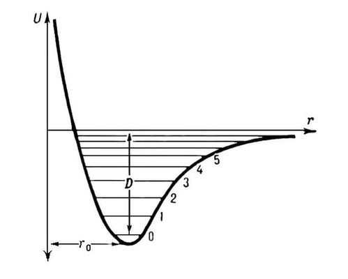 Рис. 1. Зависимость потенциальной энергии U двухатомной молекулы (или отдельной химической связи) от межатомного расстояния r (r0 — равновесное расстояние, D — энергия диссоциации, 0, 1, 2, ... — уровни энергии колебаний).