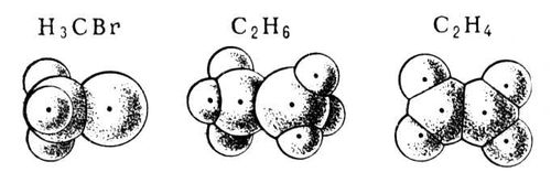 Ван-дер-ваальсовы радиусы существенно превышают ковалентные. Зная величины ван-дер-ваальсовых, ковалентных, а также ионных радиусов, можно построить наглядные модели молекул, отражающие форму и размеры их электронных оболочек (рис. 2).