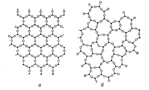Строение кварца SiO2: а — кристаллического; б — аморфного; чёрные кружки — атомы Si, белые — атомы O.