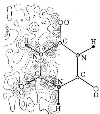 Имеются некоторые различия в природе результатов, получаемых рентгено- и нейтронографически: в первом случае экспериментально определяется положение центра тяжести электронного облака атома, во втором — центра тяжести центроида тепловых колебаний ядра. В некоторых прецизионных экспериментах это приводит к различию в межатомных расстояниях, полученных методами рентгенографии и нейтронографии. С др. стороны, такое различие может быть использовано в исследовании распределения деталей электронной плотности в молекулах и кристаллах, ответственных за ковалентную химическую связь (рис. 3), неподелённую пару электронов и др.