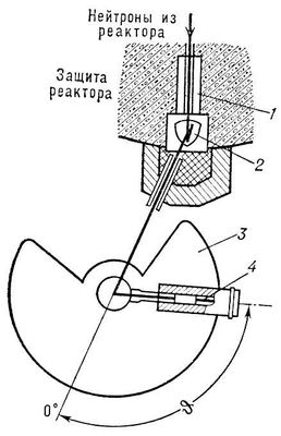 Рис. 1а — схема нейтронографической установки для исследования поликристаллических образцов: 1 — система коллимации, формирующая нейтронный пучок; 2 — блок монохроматизации для выделения нейтронов с определённой фиксированной энергией (длиной волны) из сплошного спектра нейтронов ядерного реактора; 3 — нейтронный спектрометр с детектором нейтронов 4 для измерения интенсивности нейтронного излучения под различными углами рассеяния J. Исследуемый образец помещается в центре спектрометра.