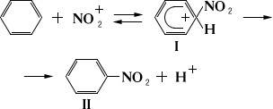 Нитрование ароматических соединений осуществляется азотной кислотой, нитрующими смесями или неорганическими солями нитрония NO; вначале образуется комплекс (I) между катионом нитрония и бензолом: