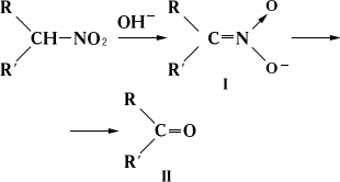 Алифатические нитросоединения получают в промышленности главным образом нитрованием парафинов азотной кислотой или окислами азота. Простейшие мононитропарафины — бесцветные жидкости со своеобразным запахом. Нитро-парафины легко восстанавливаются до гидроксиламинов и аминов. При действии оснований первичные и вторичные нитросоединения образуют соли аци-формы нитросоединений, т. н. изонитросоединений (I), легко превращающиеся в альдегиды или кетоны (II):