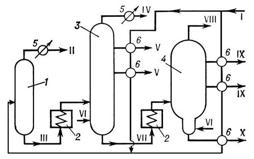 Принципиальная технологическая схема установки для атмосферно-вакуумной перегонки нефти. Аппараты: 1, 3 — атмосферные ректификационные колонны; 2 — печи для нагрева нефти и мазута; 4 — вакуумная ректификационная колонна; 5 — конденсаторы-холодильники; 6 — теплообменники. Линии: I — нефть; II — лёгкий бензин; III — отбензиненная нефть; IV — тяжёлый бензин; V — керосин и газойль; VI — водяной пар; VII — мазут; VIII — газы разложения и водяной пар; IX — масляные фракции; Х — гудрон.