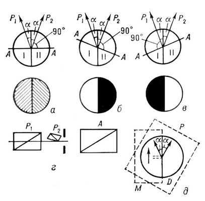 Рис. 2. Полутеневые поляризаторы. Плоскости поляризации двух их половин P1 и P2 составляют между собой малый угол 2a. Поэтому, если плоскость поляризации анализатора АА перпендикулярна биссектрисе 2a (а), обе половины I и II поля зрения имеют одинаковую освещённость, т. е. не полностью погашены (полутень, откуда название). При малейшем повороте анализатора относительная освещённость I и II резко меняется (б и в). Примеры конструкций полутеневых поляризаторов: г — схема Липпиха; P1 и P2 — две поляризационные призмы, одна из которых закрывает половину поля зрения, А — анализатор; д — схема Лорана; за поляризационной призмой Р устанавливают фазовую пластинку М в 1/2 длины волны, главная плоскость которой составляет угол a с плоскостью поляризации Р; D — диафрагма, ограничивающая поле зрения.