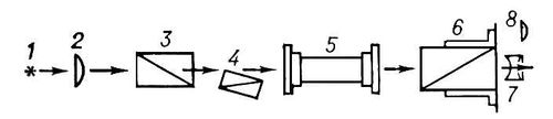 Рис. 1. Принципиальная схема полутеневого поляриметра: 1 — источник света; 2 — конденсор; 3—4 — полутеневой поляризатор; 5 — трубка с измеряемым оптически-активным веществом; 6 — анализатор с отсчётным устройством; 7 — зрительная труба; 8 — окуляр отсчётного устройства (например, микроскопа-микрометра).