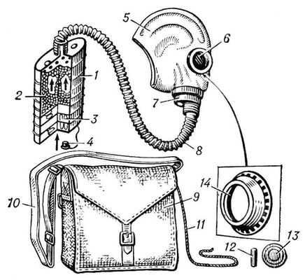 Рис. 1. Фильтрующий противогаз: 1 — противогазная коробка; 2 — специально обработанный активированный уголь; 3 — аэрозольный фильтр; 4 — резиновая пробка; 5 — шлем-маска; 6 — очки; 7 — клапанная коробка; 8 — соединительная трубка; 9 — противогазная сумка; 10 — лямка; 11 — тесьма; 12 — специальный карандаш; 13 — незапотевающие пленки; 14 — утеплительная манжета.