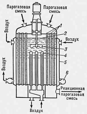 Рис. 3. Контактный аппарат для окисления нафталина во фталевый ангидрид: 1 — катализаторные трубки; 2 — расплав солей (селитрянная баня); 3 — пропеллерная мешалка; 4 — трубки для воздушного охлаждения; 5 — рубашка для воздушного охлаждения; 6 — коллектор отходящего воздуха.