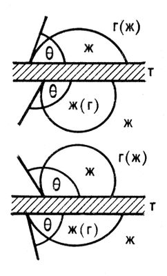 Рис. 2. Положение капли (пузырька) на твердой поверхности при различных условиях смачивания; г — газ; ж — жидкость; т — твёрдое тело.