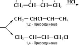 Количество образующихся продуктов 1,2-и 1,4-присоединения зависит от природы сопряжённой системы, от реагента и условий реакции. Сопряжение снижает внутреннюю энергию молекул и, следовательно, делает их более устойчивыми: величина энергии сопряжения колеблется между несколькими единицами и десятками ккал/моль (например, для бутадиена 3,6 ккал/моль, для бензола 35 ккал/моль, 1 ккал/моль =4,19 кдж/моль).