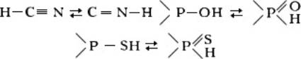 К диадной прототропной таутомерии (миграция протона в системе двух атомов) относят таутомерию синильной кислоты, кислот и тиокислот фосфора (этот тип таутомерии сопряжён с изменением валентности одного из атомов диады):