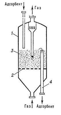 Кроме гиперсорберов, применяют адсорбер непрерывного действия с кипящим слоем адсорбента (рис. 2). В корпусе 1 одноступенчатого адсорбера имеется распределительная решётка 2, через которую снизу подаётся газ, приводящий мелкозернистый адсорбент в состояние кипящего слоя 3. Адсорбент непрерывно поступает сверху и удаляется через трубу 4 на десорбцию.