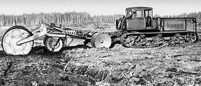 Разработка торфяных месторождений. Разработке торфа предшествуют осушение и подготовка поверхности. Подготовка поверхности месторождения выполняется после сооружения осушительной сети и окончания предварительного осушения залежи (рис. 3). Независимо от того, для каких целей будет использоваться залежь, с её поверхности удаляется древесная, а иногда и моховая растительность, разрабатываемый слой залежи на глубине 25—40 см освобождается от древесных включений или они измельчаются на фракции менее 8—25 мм. Разделённая картовыми канавами и валовыми каналами на определённые участки (карты) поверхность поля планируется в продольном направлении перпендикулярно валовым каналам и профилируется с поперечным уклоном в сторону картовых канав шнековым профилировщиком. Выполнение этих работ способствует понижению уровня грунтовых вод и уменьшению влажности торфяной залежи до 86—89%, что обеспечивает производительную работу механизмов по добыче, сушке и уборке торфа. Все операции подготовки поверхности торфяного месторождения механизированы (см. Торфяные машины). Удаление древесной растительности при подготовке включает срезку (валку) деревьев и кустарника с одновременным пакетированием и укладкой деревьев в пакетах на поверхность залежи специальной машиной (рис. 4). Затем пакеты грузятся на тракторные прицепы-самосвалы и вывозятся на промежуточные прирельсовые склады. Пни и древесные включения корчевальными машинами извлекаются из залежи или перерабатываются машинами глубокого фрезерования (рис. 5) с последующей сепарацией и вывозкой древесных остатков за пределы полей. Для получения торфа с усреднёнными кондиционными свойствами применяются машины для перемешивания залежи или дренажно-обогатительные машины, извлекающие фрезами или барами торфяную массу из слоя залежи, перерабатывающие и расстилающие слой торфа на поверхности поля. Мелкие древесные остатки и щепа убираются с рабочей поверхности карт машинами с накалывающим или барабанно-цепным рабочим органом.