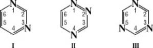 Триазины, шестичленные гетероциклические соединения, содержащие три атома азота в цикле. Известны главным образом замещенные триазины всех трёх возможных типов: вицинальные 1, 2, 3-триазины (I), несимметричные 1, 2, 4-триазины (II) и симметричные 1, 3, 5-триазины (III):