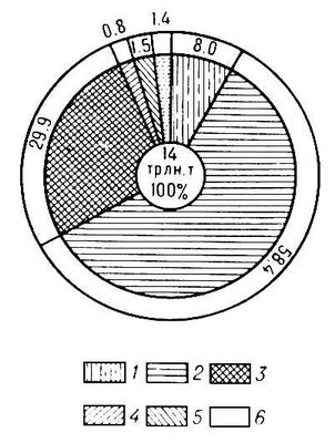 Рис. 3. Распределение учтенных (по состоянию на 1970) мировых запасов углей по континентам: 1 — Европа; 2 — Азия; 3 — Северная Америка; 4 — Южная Америка; 5 — Африка; 6 — Австралия.