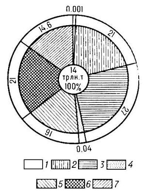 Рис. 2. Распределение учтённых (по состоянию на 1970) мировых запасов ископаемых углей по геологическому возрасту (по А. К. Матвееву) (в %): 1 — девон; 2 — карбон; 3 — пермь; 4 — триас; 5 — юра; 6 — мел; 7 — палеоген — неоген.