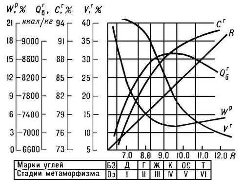 Структурно-молекулярная перестройка органического вещества при метаморфизме углей сопровождается последовательным повышением в них относительного содержания углерода, снижением содержания кислорода, выхода летучих веществ; в определённых закономерностях с экстремальными значениями на средних стадиях углефикации изменяются содержание водорода, теплота сгорания, твёрдость, плотность, хрупкость, оптические, электрические и др. физические свойства углей ископаемых (рис. 1). Для определения этих стадий используются: выход летучих веществ V Г, содержание углерода, микротвёрдость и др. особенности химического состава и физических свойств углей. Наиболее эффективен метод определения стадии углефикации по отражательной способности витринита ®.