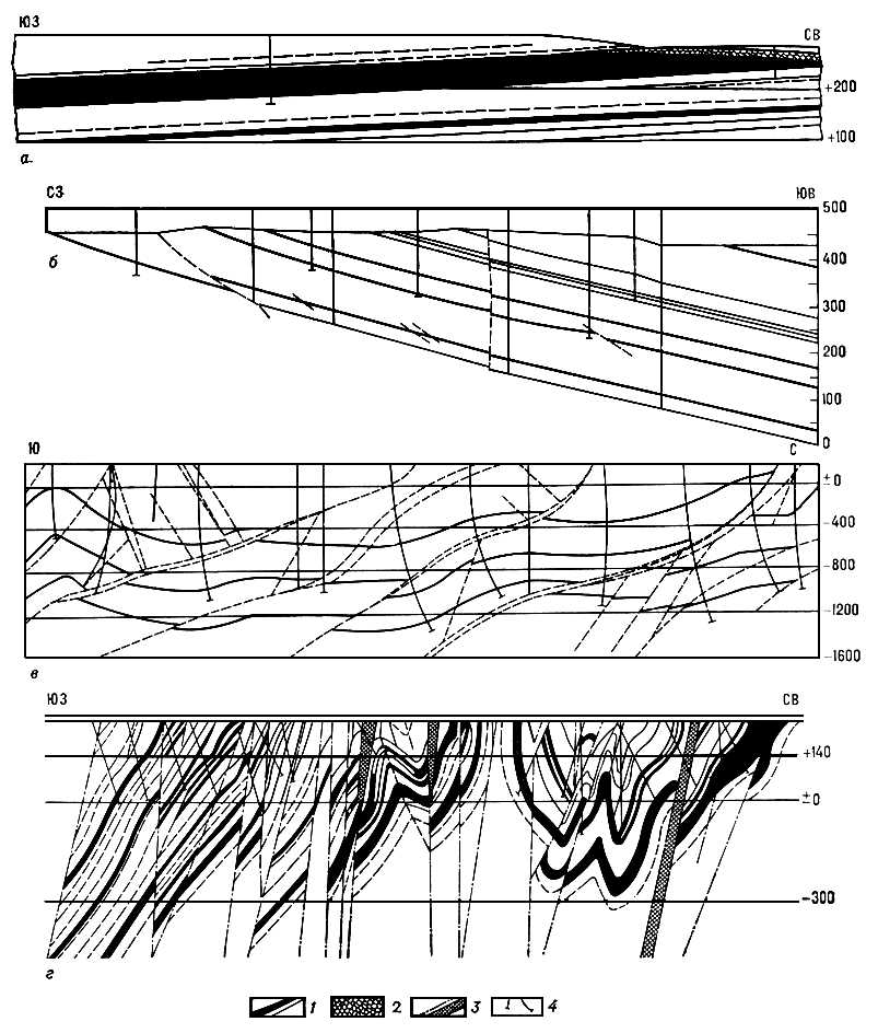Рис. 4. Примеры месторождений с различной сложностью тектоники: а — Итатское, Канско-Ачинский бассейн; б — Саранский участок, Карагандинский бассейн; в — Алмазно-Марьевский район, Донбасс; г — Бачатский район, Кузбасс. 1 — угольные пласты; 2 — зоны выгорания угля; 3 — разрывные нарушения; 4 — скважины.