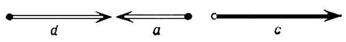 Рис. 2. Схематическое изображение величин и направлений векторов намагниченности катионов, образующих магнитные подрешётки d, а и c в ферритах-гранатах.