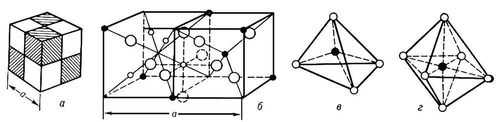 Рис. 1. Кристаллическая структура ферритов-шпинелей: а — схематическое изображение элементарной ячейки шпинельной структуры (ее удобно делить на 8 равных частей — октантов); б — расположение ионов в смежных октантах ячейки (заштрихованном и белом), белые кружки — ионы О2-, чёрные — ионы металла в октаэдрических и тетраэдрических промежутках; в — ион металла в тетраэдрическом промежутке; г — ион металла в октаэдрическом промежутке.