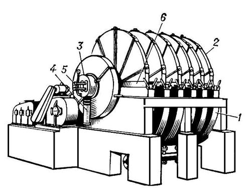 Рис. 2. Дисковый фильтр: 1 — секции; 2 — фильтрующие элементы — диски; 3 — распределительное устройство; 4 — трубопровод для соединения с источником вакуума и удаления фильтрата; 5 — трубопроводы для подачи сжатого воздуха; 6 — ножи для съёма осадка.
