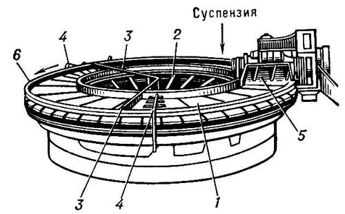 Рис. 4. Тарельчатый фильтр: 1 — фильтровальная ячейка; 2 — соединительная трубка; 3 — устройство для устранения трещин в осадке; 4 — устройство для распределения промывной жидкости; 5 — устройство для удаления осадка; 6 — борт.
