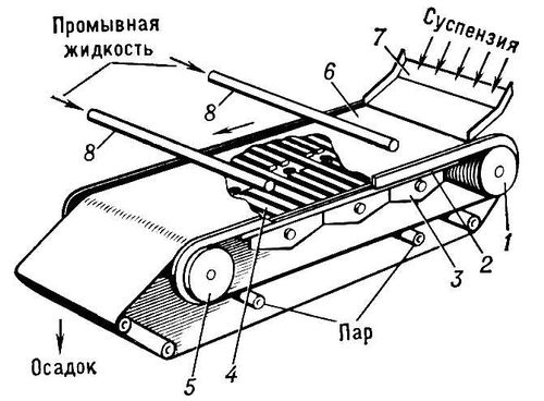 Ленточный вакуум-фильтр (рис. 3) предназначен для разделения суспензий, образующих неоднородный по размерам частиц тяжёлый и требующий тщательной промывки осадок. Фильтр представляет собой стол, в котором имеются вакуум-камеры для отвода фильтрата и промывной жидкости. ФП (обычно ткань) покрывает прорезиненную перфорированную ленту, натянутую на крайних барабанах стола. Осадок сбрасывается в сборник при перегибе ФП. Регенерация ФП производится при обратном движении ленты с помощью механических щёток или паровых форсунок.