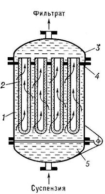 Патронный фильтр (рис. 1) применяют для осветления или сгущения суспензий; работает под вакуумом или под давлением и состоит из корпуса с крышкой и днищем. Внутри находится решётка, на которой закреплена ФП в виде патрона (обычно патронный фильтр имеет несколько десятков таких патронов). Удаление осадка с последней производится отдувкой сжатым воздухом, пневмогидравлическим ударом или с помощью вибрационных устройств.