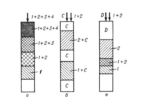 Основные варианты проведения хроматографического процесса: а — фронтальный; б — проявительный; в — вытеснительный; 1, 2, 3, 4 — разделяемые вещества; C — несорбирующаяся подвижная фаза; D — вытеснитель.