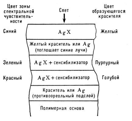 Наибольшее распространение в современной любительской и профессиональной кино- и фотосъёмке и цветной печати получили субтрактивные процессы на многослойных цветофотографических материалах (МЦМ); первые МЦМ были выпущены в 1935 американской фирмой «Истмен Кодак» и в 1938 германской фирмой «Агфа» и обрабатывались методом обращения. Цветоделение в МЦМ достигается путём избирательного поглощения основных цветов 3 галогеносеребряными светочувствительными слоями, размещенными на единой основе (см. рис. 1), а цветное изображение образуется органическими красителями в результате т. н. цветного проявления, основы которого были заложены нем. химиками Б. Гомолька (в 1907) и Р. Фишером (в 1912). Цветоделение в МЦМ осуществляется благодаря тому, что верхний слой фотоэмульсии не содержит сенсибилизаторов и поэтому чувствителен только к лучам синей трети видимого спектра (см. Сенсибилизация оптическая), средний слой оптически сенсибилизирован к лучам зелёной трети, а нижний — к лучам красной трети. Для предотвращения действия синих лучей на галогениды серебра среднего и нижнего слоев между верхним и средним слоями помещен жёлтый светофильтр (органический краситель или золь металлического серебра в желатине). Указанное строение МЦМ обеспечивает образование в каждом из 3 эмульсионных слоев скрытого фотографического изображения только под действием лучей соответствующей трети видимого спектра. Цветное проявление осуществляется с помощью специальных проявителей на основе т. н. цветных проявляющих веществ, в качестве которых обычно используют производные парафенилендиамина, главным образом N, N-диэтилпарафенилендиаминсульфат (C2H5)2NC6H4NH2×H2SO4 и N-оксиэтил -N - этилпарафенилендиаминсульфат (HOC2H4) N (C2H5) C6H4NH2×H2SO4. Указанные вещества, в отличие от черно-белых проявляющих веществ, не только превращают галогенид серебра в металлическое серебро, но и участвуют (в окисленной, в результате этого процесса, форме) вместе с присутствующими в эмульсионных слоях т. н. цветными компонентами в образовании органических красителей. Поскольку в соответствии с основным принципом субтрактивного цветовоспроизведения цвет частичных изображений должен быть дополнительным к цвету лучей, избирательно поглощаемых (при съёмке) светочувствительными слоями МЦМ, цветные компоненты заранее подбираются так, чтобы при проявлении в верхнем (синечувствительном) слое образовался жёлтый краситель, в среднем (зелёночувствительном) — пурпурный и в нижнем (красночувствительном) — голубой. В качестве цветных компонент, образующих азометиновые красители жёлтого цвета, используются, например, некоторые замещенные b-кетоны, ацилуксусные кислоты и кетоны гетероциклического ряда; для образования красителей пурпурного цвета — производные гетероциклических соединений (пиразолона, кумарона, тионафтенона) и ароматических, например паранитробензилцианид и бензоилацетонитрил; голубые хинониминовые (индоанилиновые) красители образуются из цветных компонент — производных бензольного и нафталинового ряда, главным образом a-нафтола и оксидифенила, а также некоторых гетероциклических соединений, например 8-оксихинолина. С целью предотвращения диффузии цветных компонент в смежные слои МЦМ в их молекулы вводят длинноцепочечные алкильные радикалы или остатки высших жирных кисло