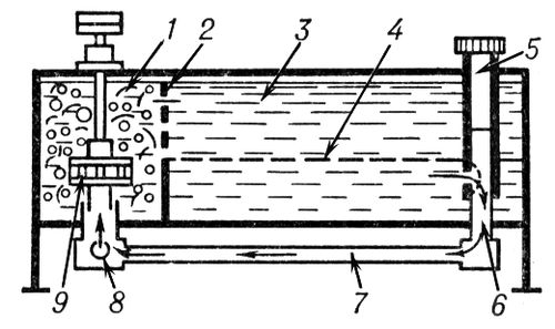 Рис. 4. Ящичный экстрактор: 1 — камера смешения; 2 — жалюзийная перегородка; 3 — отстойная камера; 4 — граница раздела фаз; 5, 6 — регулирующие трубки; 7 — рециркуляционная трубка; 8 — всасывающий коллектор; 9 — турбинная мешалка.