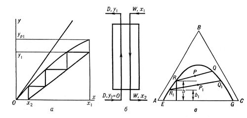 с однозначно определяется заданными концентрациями х, у и ур, поэтому для достижения больших значений М стремятся увеличить К путём турбулизации потоков взаимодействующих фаз и F — путём диспергирования одной из фаз (экстрагента или исходного раствора) на мелкие капельки. Точное значение К пока не может быть рассчитано теоретическим путём, поэтому эффективность процесса экстракции выражают, как и при ректификации или абсорбции, числом ступеней равновесия (идеальных тарелок). Графическое определение числа ступеней равновесия показано на рис. 1, а. В случае частичной растворимости растворителя А и экстрагента С равновесие системы изображается в плоскости равностороннего треугольника (рис. 1, в). Каждой точке внутри треугольника соответствует тройная смесь, в которой концентрации компонентов А, В, С измеряются длинами перпендикуляров, опущенных на противолежащие стороны. Под кривой EG (бинодальной кривой) расположена область гетерогенных смесей, а над кривой — гомогенных растворов. Процессы экстракции, поскольку в них чередуются акты смешения и расслаивания фаз, протекают только в гетерогенной области. Смешав исходный раствор с некоторым количеством экстрагента, получим тройную гетерогенную смесь Р, которая расслаивается на экстракт Q и рафинат R с концентрацией экстрагируемого вещества В. Если теперь смешать рафинат со свежей порцией экстрагента, получим новую гетерогенную смесь P1, которая расслоится на экстракт Q1 и рафинат R1 с более низкой концентрацией Q1. Положение прямых QR и Q1R1, называется конодами, определяется для каждой системы экспериментальным путём. Продолжая акты смешения и расслаивания, можно добиваться дальнейшего понижения концентрации компонента В в рафинате, т. е. повышения степени экстракции. Совершенно очевидно, что число построенных конод (их может быть сколько угодно) равно числу ступеней равновесия. В приведённом примере периодической экстракции после каждого акта смешения и расслаивания падает концентрация В как в рафинате, так и в экстракте. Для повышения концентрации вещества В в экстракте и большего его исчерпывания из рафината во многих случаях прибегают к экстракции с так называемой обратной флегмой. Сущность этого процесса сводится к частичному отделению экстрагента от экстракта и исходного растворителя от рафината и обратному возвращению долей этих фракций в аппарат навстречу уходящим потокам.